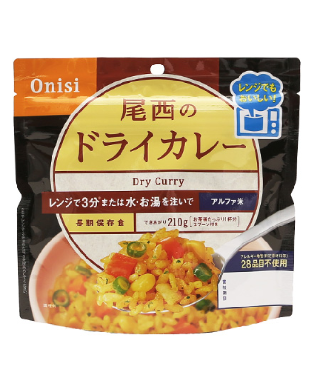 | 原材料 | うるち米(国産)、味付乾燥具材(さやいんげん、味付玉ねぎ、コーン、人参)、調味粉末(食塩、砂糖、カレーパウダー、オニオンパウダー、コーンスターチ、たん白加水分解物、ターメリックパウダー、ガーリックパウダー、クミンパウダー、コリアンダーシードパウダー、食用植物油脂、パセリ)/調味料(アミノ酸等)、微粒酸化ケイ素、リン酸カルシウム、香料、トレハロース、酸化防止剤(ビタミンE) |