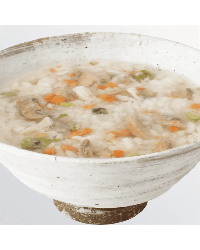 鶏肉、マッシュルーム、にんじんなどの具材とふっくらと炊き上がった国産米を、醤油、昆布だし、鰹だしで煮込みました。出汁の効いたやさしい味の雑炊です。