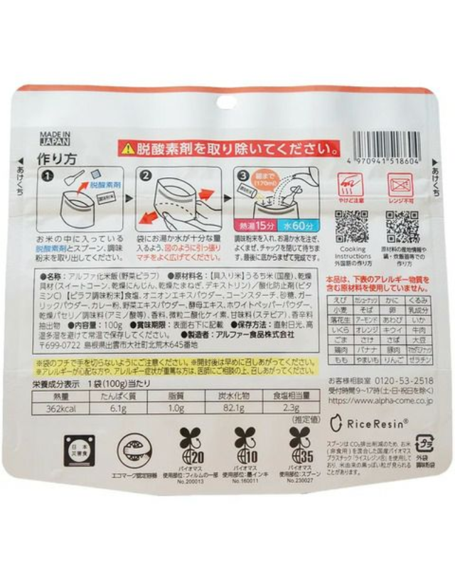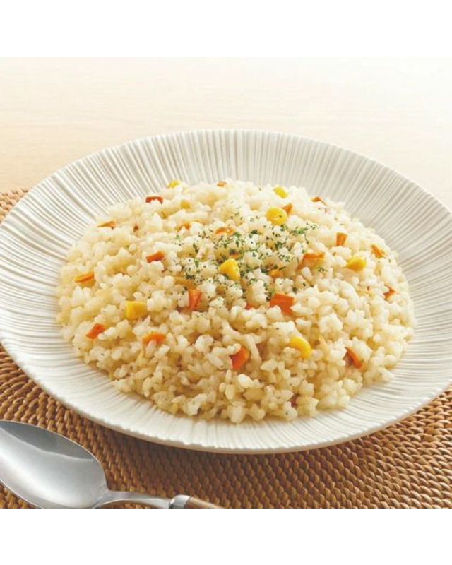 | 原材料 | ●具入り米:うるち米(国産)、乾燥具材(スイートコーン、乾燥にんじん、乾燥たまねぎ、デキストリン)/酸化防止剤(ビタミンC) ●ピラフ調味粉末:食塩、オニオンエキスパウダー、コーンスターチ、砂糖、ガーリックパウダー、カレー粉、野菜エキスパウダー、酵母エキス、ホワイトペッパーパウダー、乾燥パセリ/調味料(アミノ酸等)、香料、微粒二酸化ケイ素、甘味料(ステビア)、香辛料抽出物 |