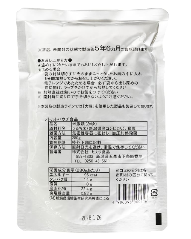 原材料名 うるち米(新潟県産コシヒカリ)、食塩