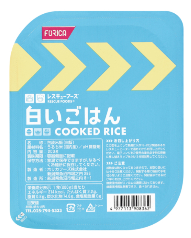 「レスキューフーズ 白いごはん」は、国産米をふっくら炊き上げ、長期保存可能な容器に封入した非常食用白飯です。