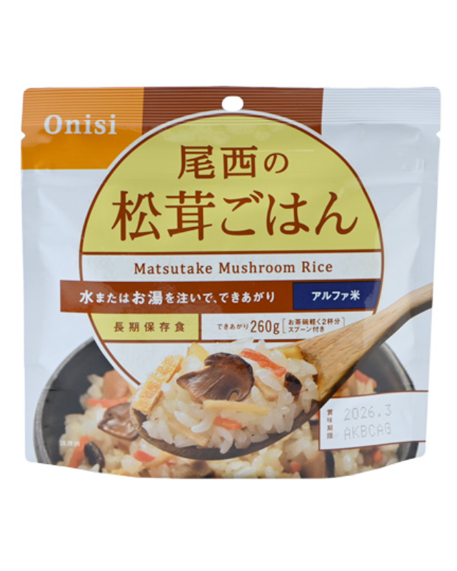 松茸・油揚げ・にんじん・ごぼうを使用し、かつおと昆布のだしで風味豊かに仕上げたアルファ化米の松茸ごはんです。