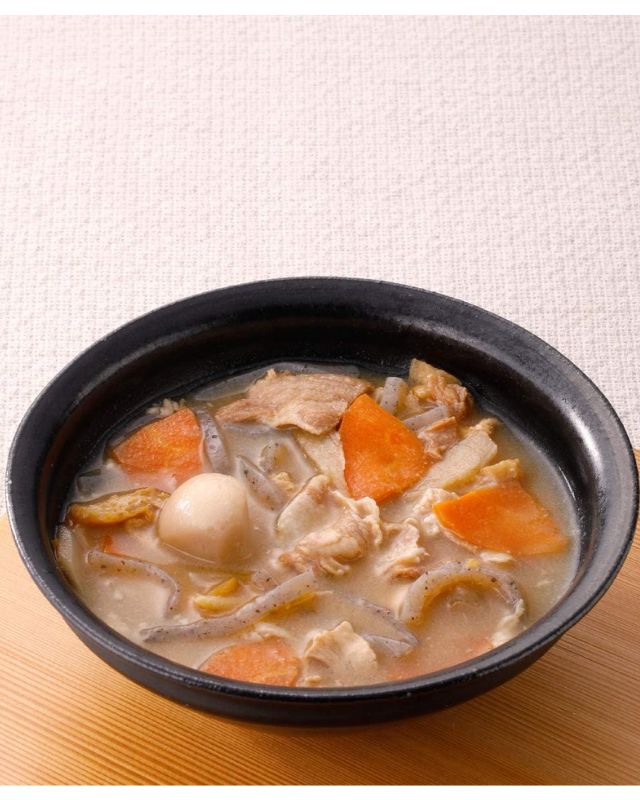 人参、ごぼう、里芋、こんにゃくなどの根菜類に豚肉を加え、かつおだしと味噌の風味豊かなスープでじっくり煮込みました。