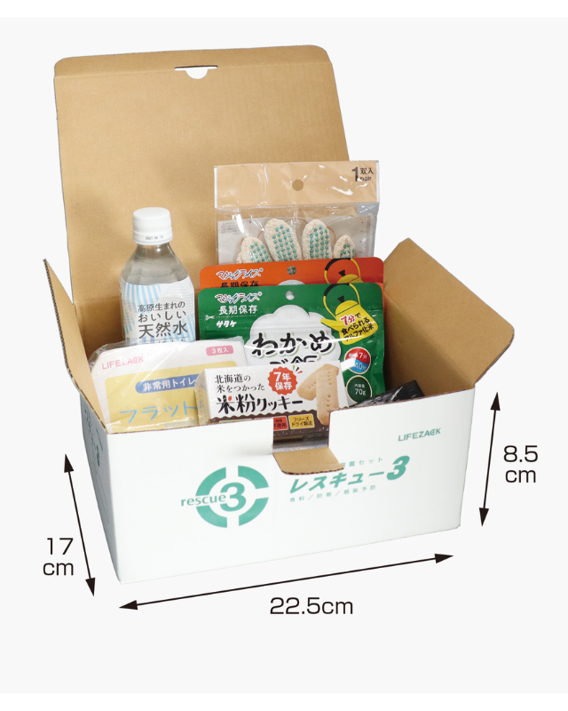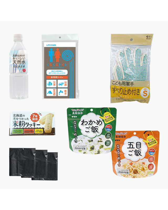 必要不可欠な3種「水、食糧、トイレ」に、アレルギー体質の方にも安心して食べられるアルファ化米・米粉クッキーをセットしました。必要に応じてこども用軍手をプラスできます。
