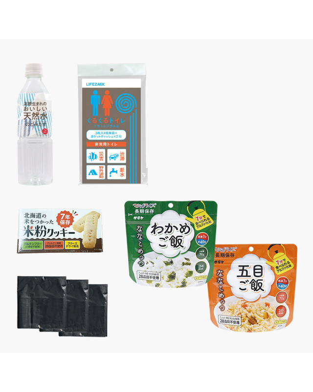 わかめご飯と五目ご飯のアルファ化米、やさしい甘みの米粉クッキー、のどみたす保存水、非常用トイレ袋、ポリ袋をひとまとめに、非常時にも安心して食べられる非常食6食分がセットになっています。