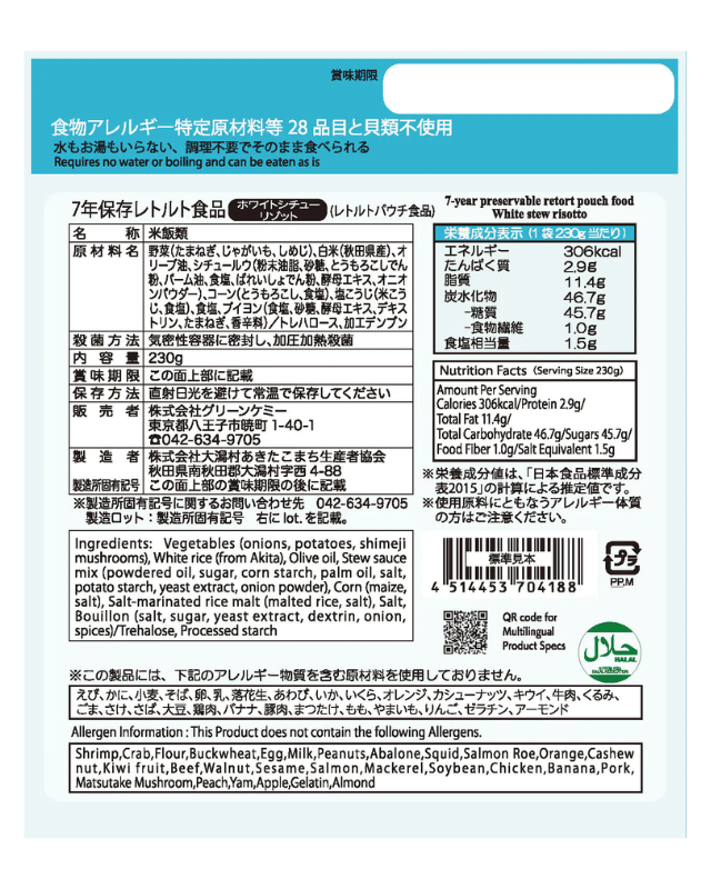 | 原材料名 | 野菜(たまねぎ、じゃがいも、しめじ)、白米(秋田県産)、オリーブ油、シチュールウ(粉末油脂、砂糖、とうもろこしでん粉、パーム油、食塩、ばれいしょでん粉、酵母エキス、オニオンパウダー)、コーン(とうもろこし、食塩)、塩こうじ(米こうじ、食塩)、食塩、ブイヨン(食塩、砂糖、酵母エキス、デキストリン、たまねぎ、香辛料)/トレハロース、加工デンプン |