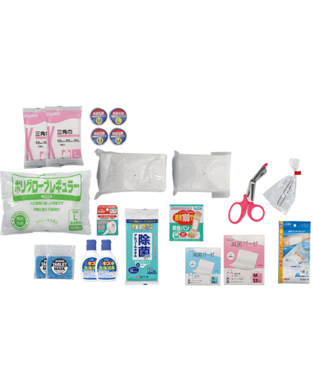 救急絆創膏、滅菌パッド、ガーゼ、消毒液など、