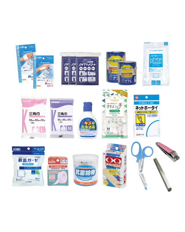 三角巾・包帯・ガーゼ・絆創膏などの基本的な救急用品に加え、