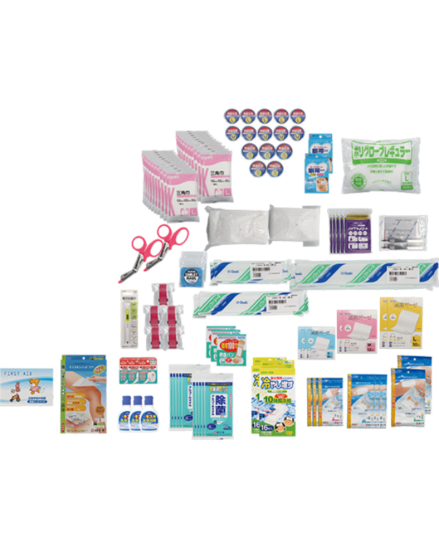滅菌ガーゼ・防水パッド・冷却シート・絆創膏など、軽傷〜中程度の応急処置に対応した構成のため、