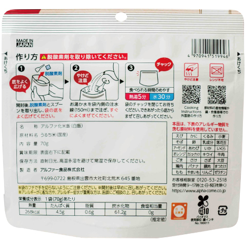 安心米クイック白飯は、熱湯5分・水30分で戻せる時短仕様のアルファ化米です。