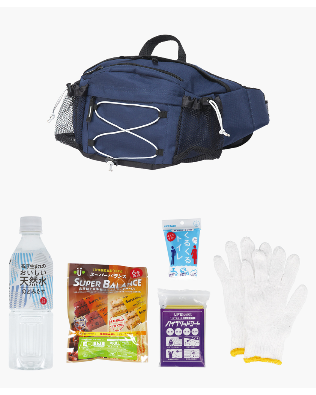 非常用トイレ、保存水、エネルギー補給食、保温シート、軍手など、初動で役立つ基本アイテムをウエストポーチにまとめ、すぐに持ち出せる設計にしました。腰に装着するため両手が自由になり、暗い道や混雑した場所でも安全に移動ができます。